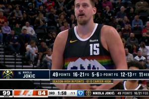 約基奇三節(jié)狂砍52分11籃板6助攻 本賽季聯(lián)盟第5個(gè)50+!