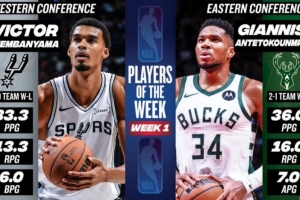 文班場均33+13+6!字母哥場均36+16+7!兩人當選首周東西部周最佳