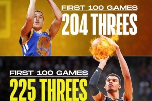 文班生涯前100場三分命中數(shù)為225!高于水花各自前100場命中數(shù)!