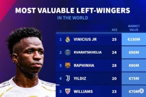 左邊鋒德轉(zhuǎn)身價(jià)排行:維尼修斯1.5億歐居首,K7、拉菲9000萬(wàn)歐