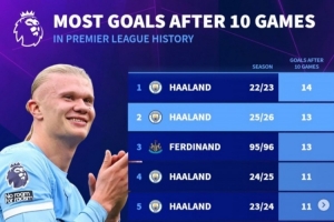 英超前10輪進球榜:前五哈蘭德占四席,22-23賽季14球歷史最多
