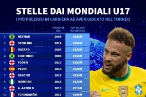 曾參加U17世界杯球員身價榜:內(nèi)馬爾1.8億歐居首,斯特林次席