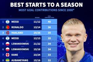 僅次于梅羅!本世紀賽季開局進球貢獻數(shù):哈蘭德35球位列歷史第三