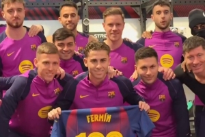 恭喜!22歲費爾明獲巴薩一線隊生涯百場紀念球衣,隊友簇擁祝賀