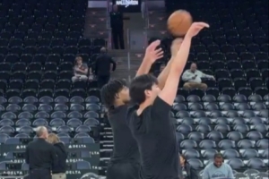 練起來!楊瀚森賽前和夏普一起進(jìn)行三分投籃熱身