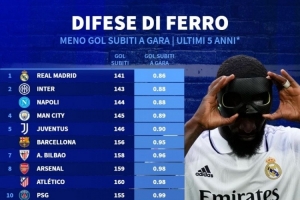 近5年五大聯(lián)賽場均失球最少榜:皇馬居首,國米、那不勒斯前三
