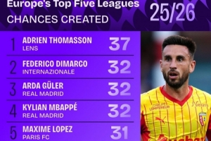 五大聯(lián)賽創(chuàng)造機會榜:迪馬爾科、居勒爾列二三,姆巴佩、B費在列