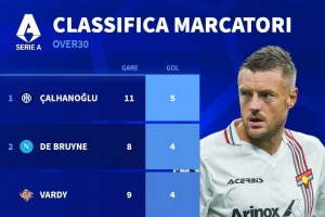 意甲年齡30+球員射手榜:恰爾汗奧盧5球居首,丁丁、瓦爾迪4球